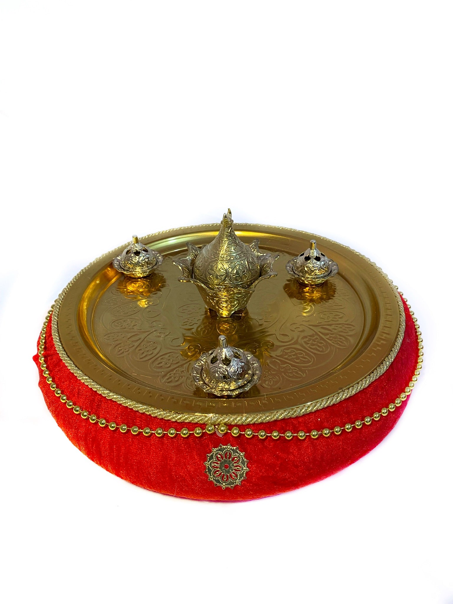 Kırmızı kadife detaylı metal işlemeli tepsi ve sepet